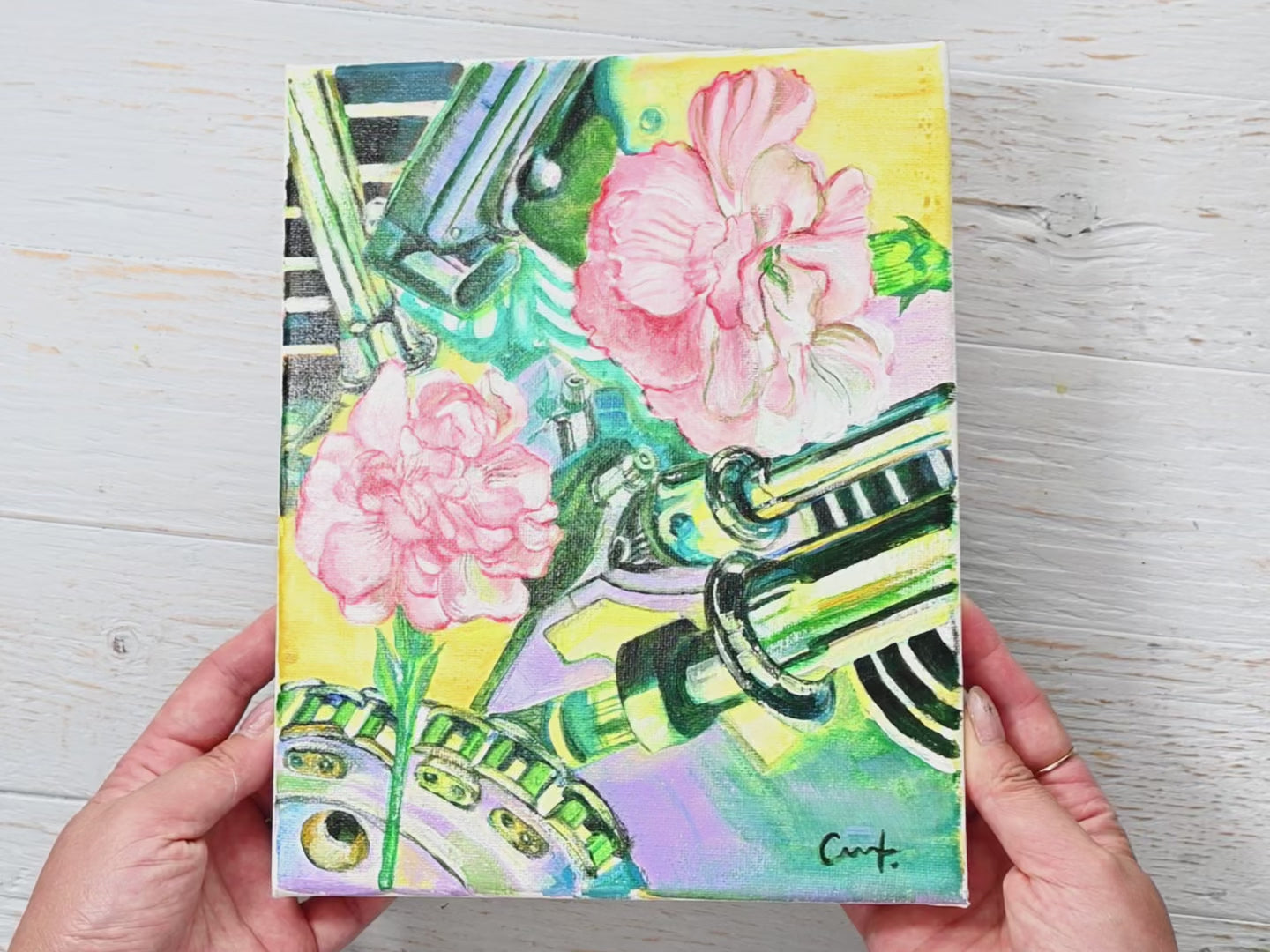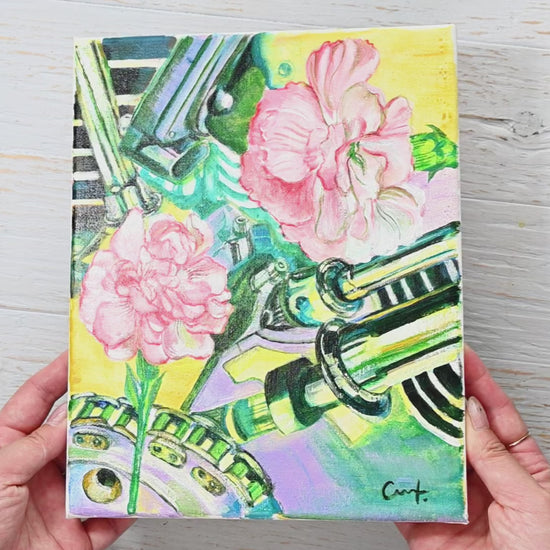 A vivid interplay of soft carnation petals and rigid mechanical forms. The delicate blossoms weave through gears and structures, symbolizing the coexistence of fragility and strength.